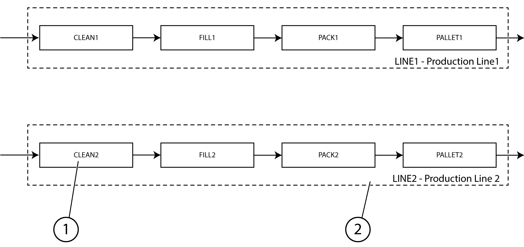 A resource group (2) consists of a logical grouping of machines and/or work centers (1). Often a production line is represented by a resource group. A production line consists of several resources, where every resource in turn may consist of several equipment modules. A machine or work center stays the plannable entity.