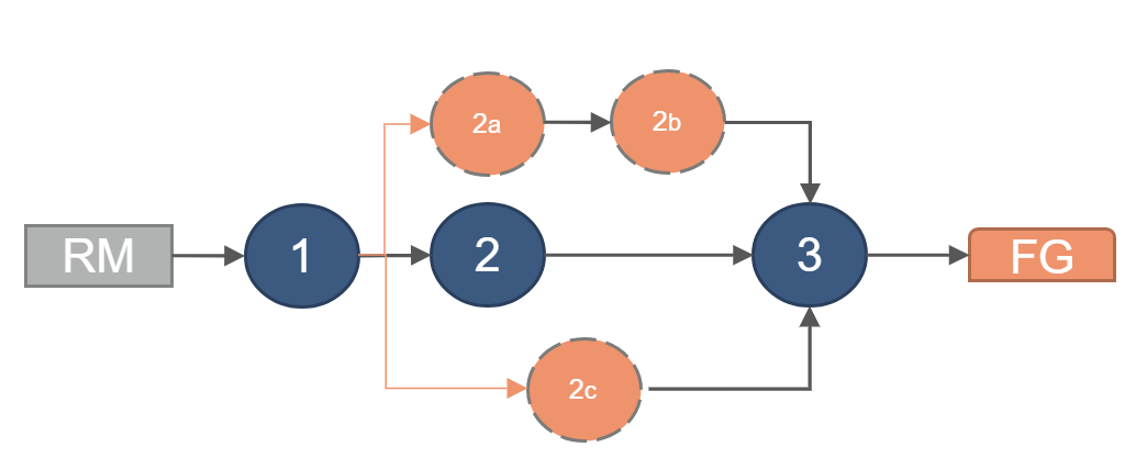 For example, the production of a finished good (FG) has a default route that includes operations 1, 2, and 3 in a sequential order. If Operation 2 develops a defect during production, you can activate an alternative route, replacing operation 2 by a single operation 2c or by a set of operations 2a and 2b in a sequence. When operation 2 becomes functional again, you can switch from the alternative operation to the default operation.