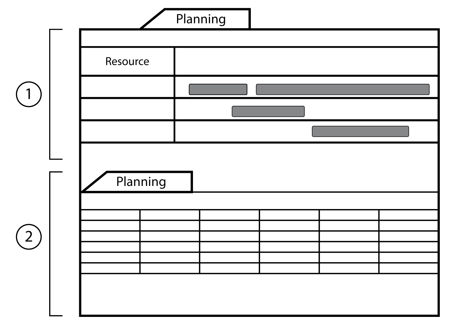 The resources (machines and work centers), possibly plannable (if configured in the planning cells), are available on the planning board. The production order or operation becomes visible on the planning board as soon as it is in the status PLANNED.