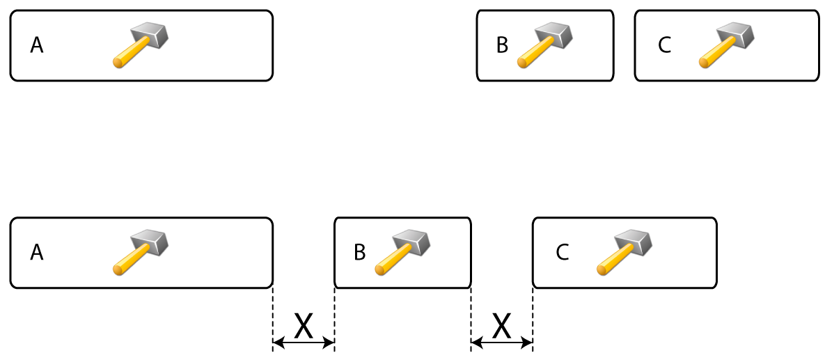 Operations can be distributed over the Gantt diagram with a fixed interval. The entered interval (X) is the time between when one operation stops and the next one starts.