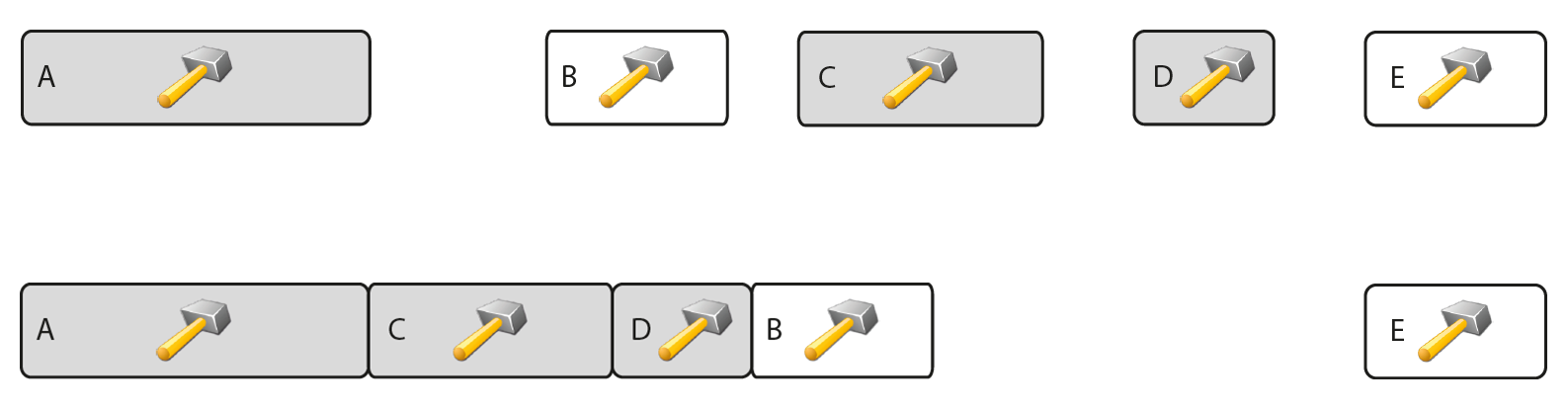 To have similar consecutive operations on a resource, (already planned) operations that are similar in nature (A, C and D) can be selected and grouped. All these operations are planned after the first selected operation (A). Any operations (B) lying in between the grouped operations will be moved in the planning afterwards.
