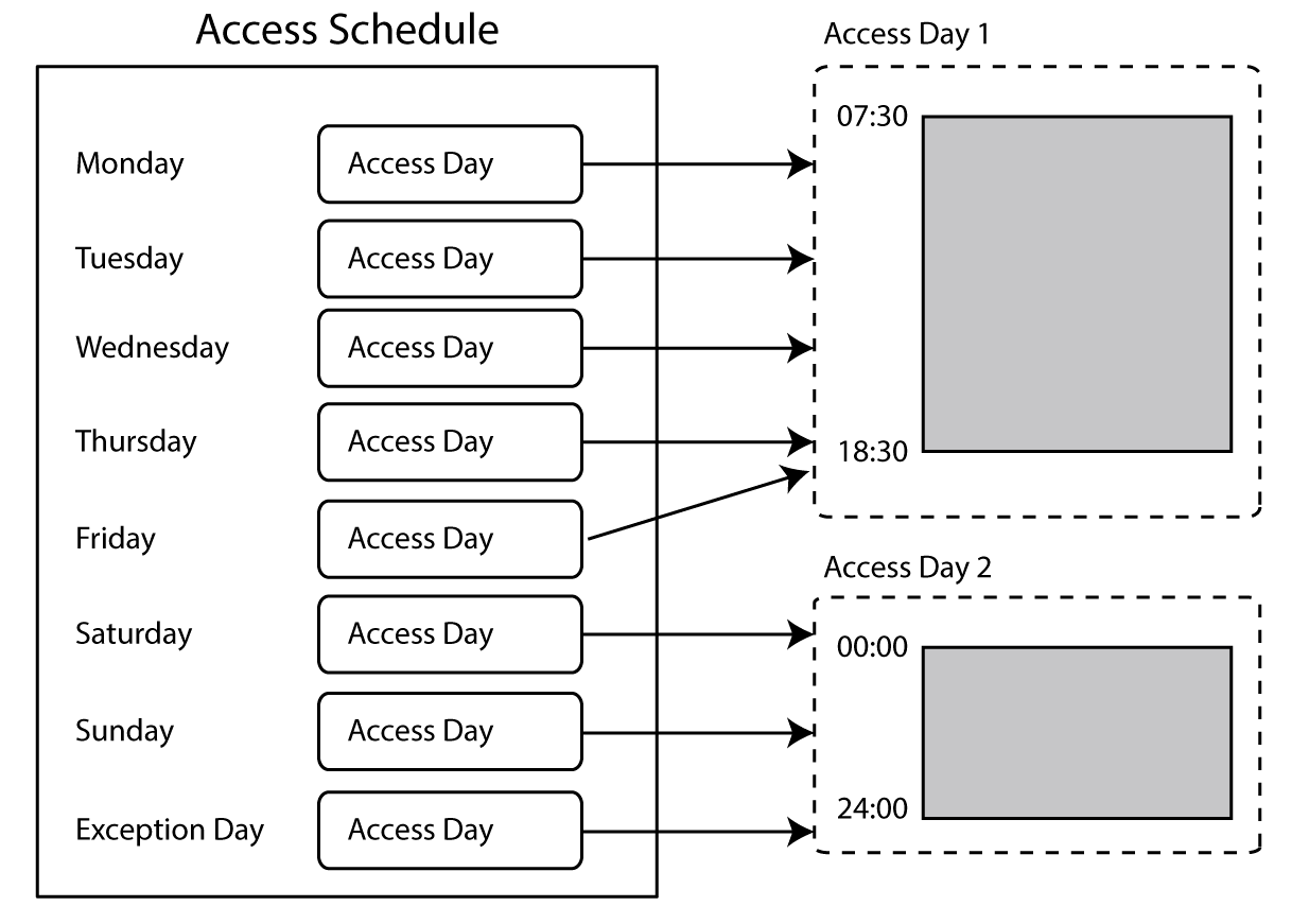 In an access schedule you can set, per day, when access is granted. This is done by adding access days to the various days (Monday up to Sunday + exception day).