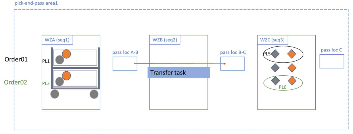 In this flow, for Order 1 and Order 2, the inventories are in work zones A and C, with work zone B serving as a transfer zone. To adapt to this scenario, the picking process involves the creation of transfer tasks for work zone B. When the items from work zone A are picked, the pick cart is added to the designated drop-off location. Because of the transfer task, the pick cart is then automatically transferred to the next drop-off location without undergoing any additional picking processes in work zone B. When the pick cart reaches work zone C, the picking process continues until all the items for both orders are picked.