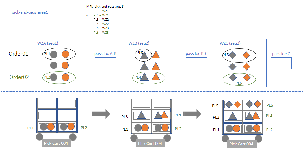 Flow 1: Multi-pick list in a Pick & Pass Zone with a separate LPN per work zone.
