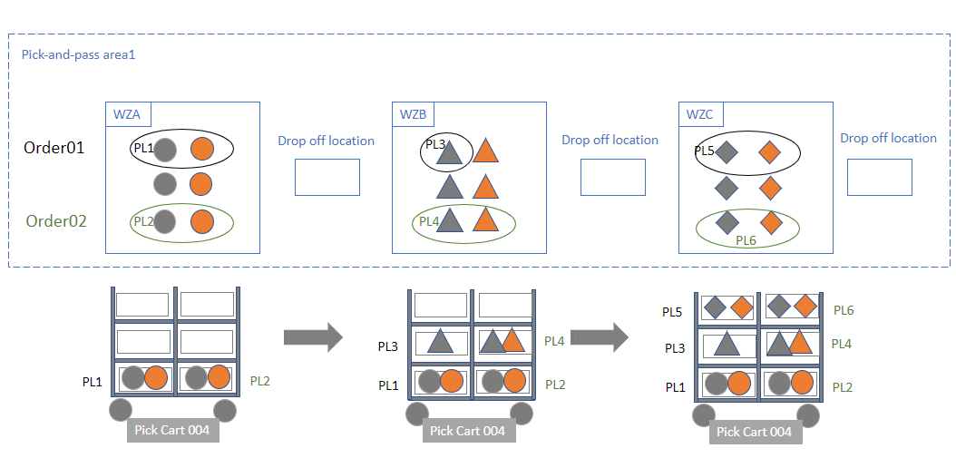 For Order 1 and Order 2, if the inventory is in three different work zones: A, B, and C, one or more multi-order pick list can be created for each work zone. The inventory for both Order 1 and Order 2 is picked from each work zone and then passed to the next zone via drop off location until all the items for both orders are picked.