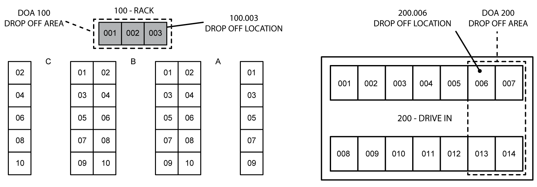 Drop off locations are locations where the picked goods will be dropped off by the picker before they are collected to be marshaled. Drop off locations are configured in drop off areas.