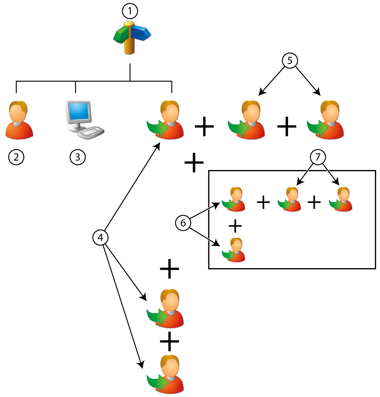 Multiple tasks (4) can be added to the work profile. An equivalent task (5) can be added to a task. Interleave tasks (6) can be added to a task. An equivalent interleave task (7) can be added to an interleave task.