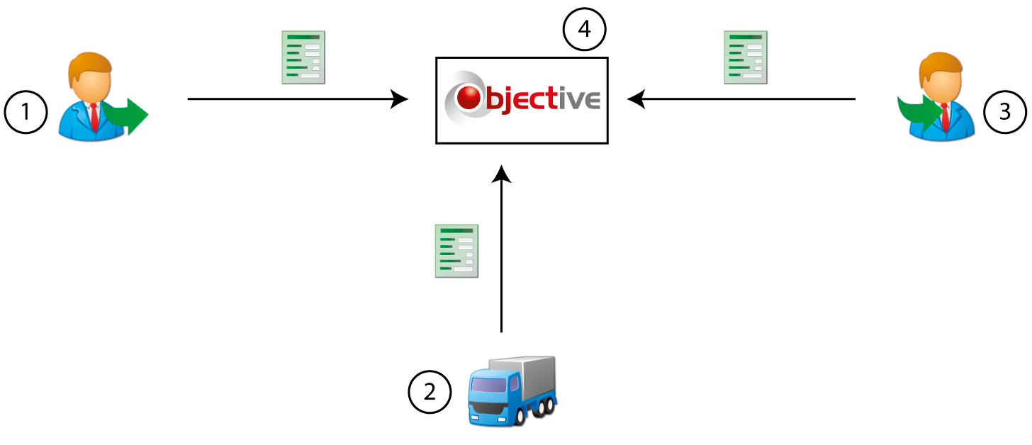 Assets can be received from a supplier (1), carrier (transporter) (2) or customer (3), without a reference or with an order reference (receipt, return, or shipment).