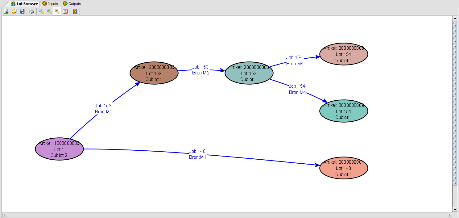 The lot browser can visualize the flow of the production process. To do this, first open a session in the lot browser and add a lot to the session. Next you can check the (source) lots of the lot and which lots are using the lot.